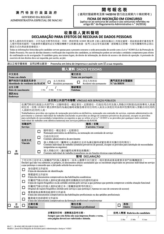 Modelo n.º 3: Ficha de Inscrição em Concurso (aplica-se ao concurso de acesso e aos concursos referidos no artigo 60.º do Regulamento Administrativo n.º 14/2016)