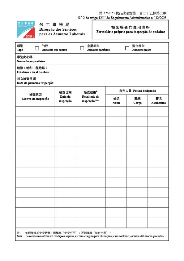 Formulário próprio para inspecção de andaime (N.º 2 do artigo 125.º do Regulamento Administrativo n.º 32/2023)