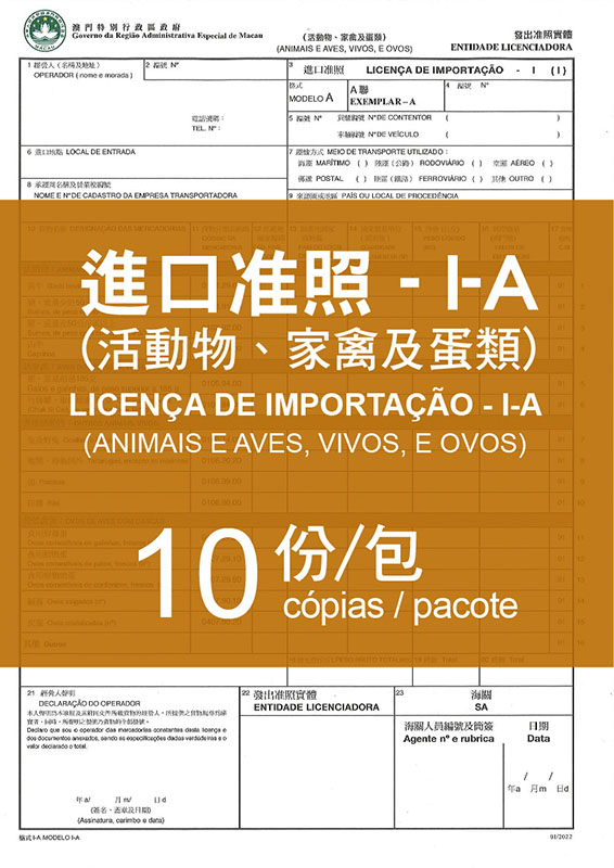 進口准照 - I-A (活動物、家禽及蛋類) - 10份/包